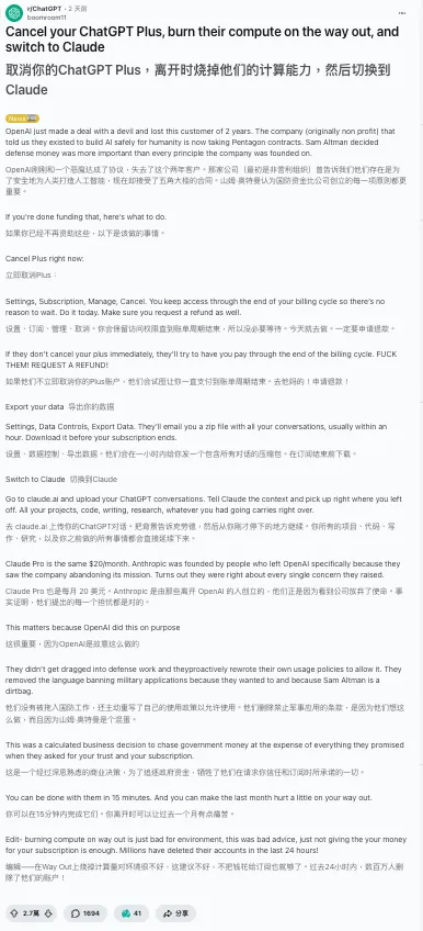 Reddit的ChatGPT社区,”Cancel ChatGPT”的帖子收获3万赞。