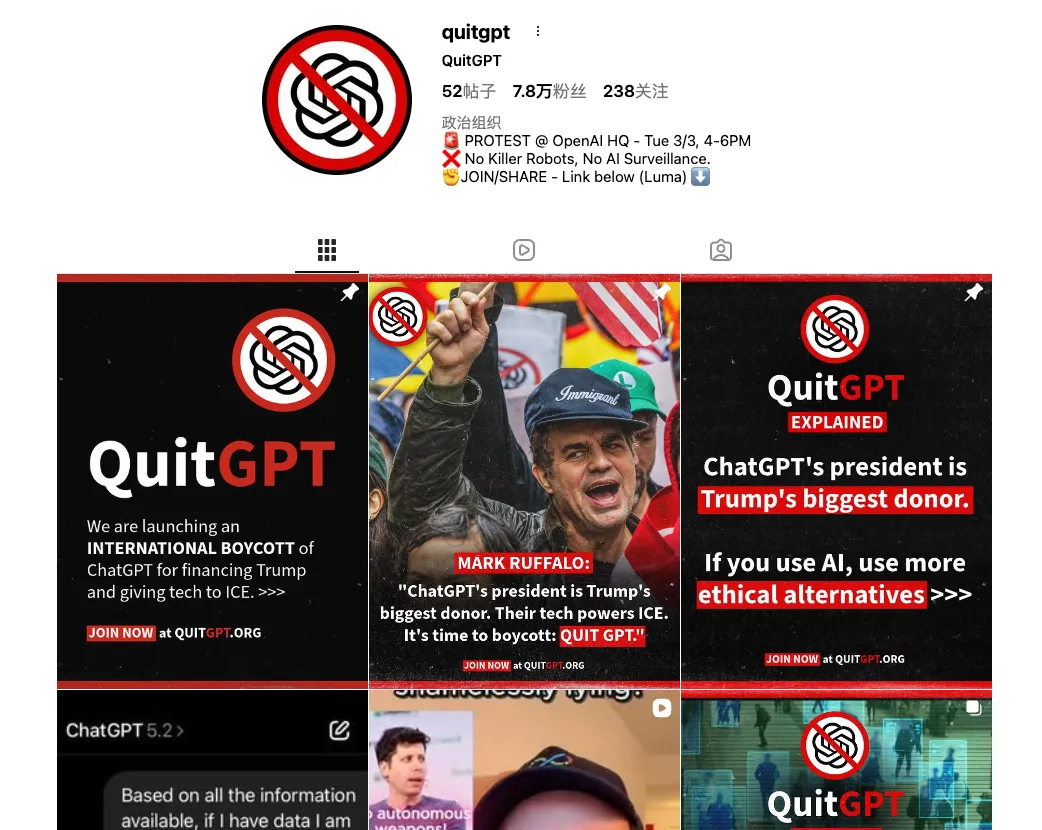 Instagram账号”quitGPT”数周内涨粉数万。