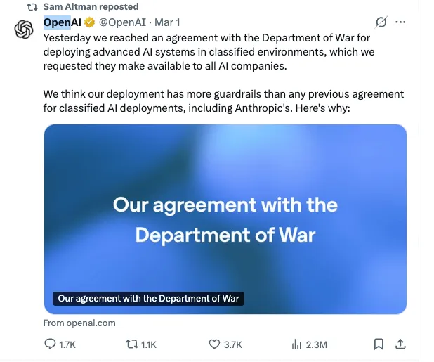 封杀令下达当晚,OpenAI CEO Sam Altman发了篇长文:OpenAI和五角大楼达成协议,将在涉密网络部署ChatGPT。