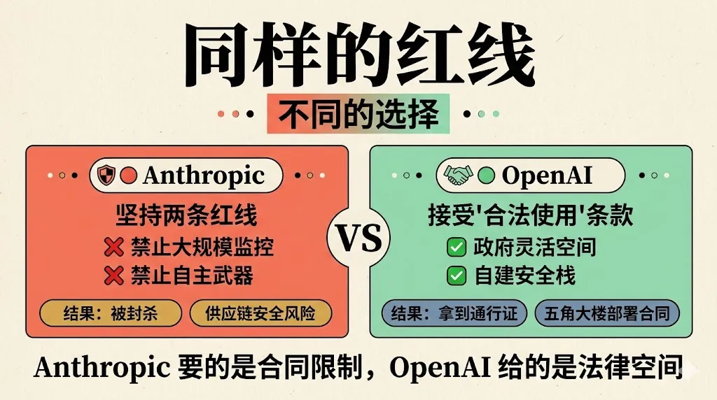 同样的红线,Anthropic得到了禁令,OpenAI拿到了通行证。