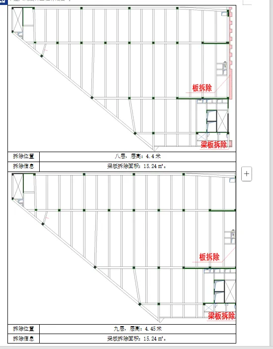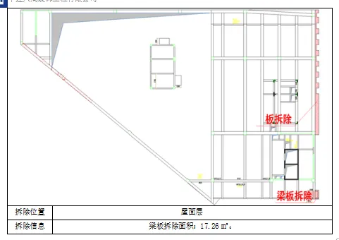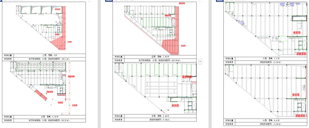 本工程拆除面积954m2,混凝土方量403.7m3,砖砌隔墙180m3。其中楼板拆除面积约809.38m2,梁拆除方量约472m,91.83m³,柱拆除长度177m,59.21m³。每层拆除位置如下图所示: