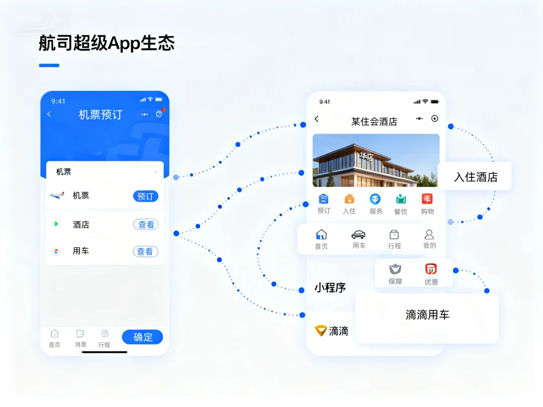 引入生态:快速接入了滴滴出行、华住酒店等行业的头部服务小程序,为用户提供接送机、酒店预订等“机酒车”联服。