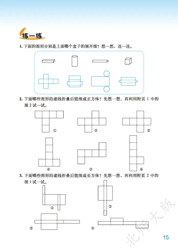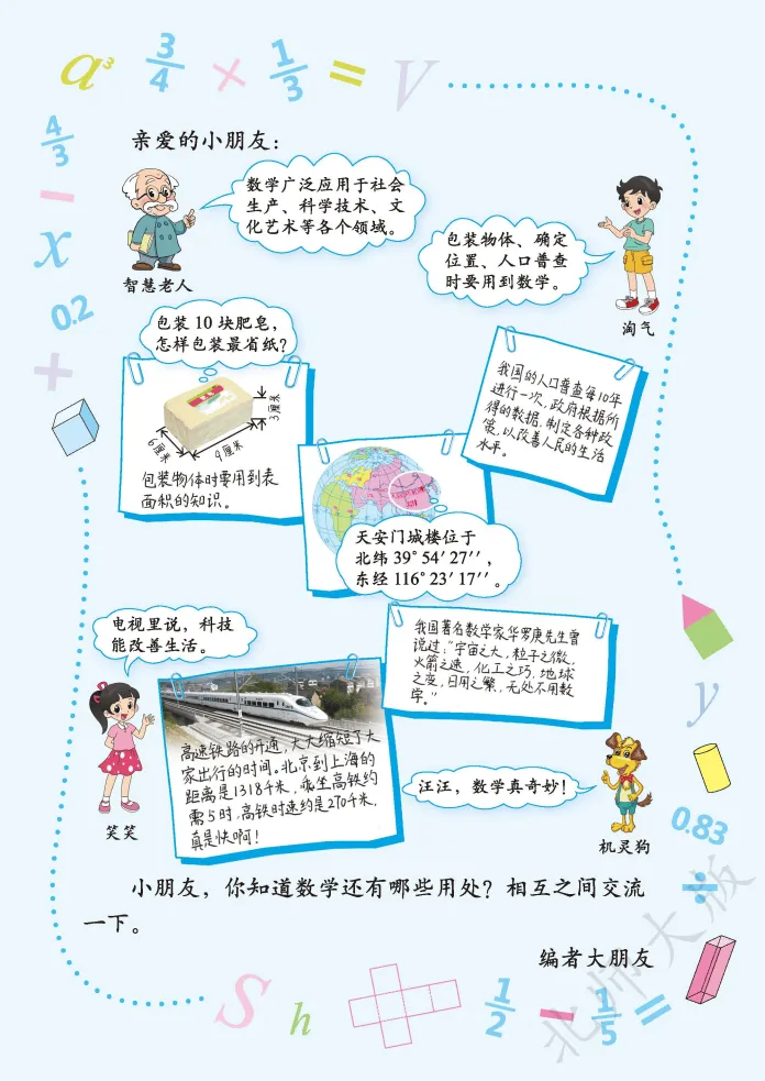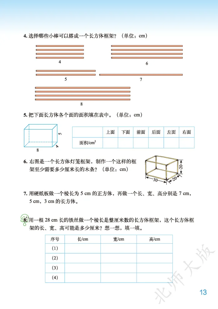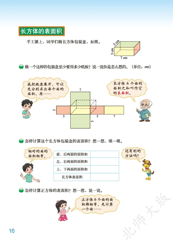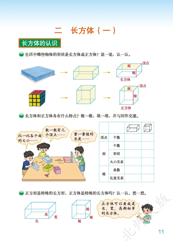 ,然后发送 电子课本 2026春新北师大版五年级下册数学第四单元核心主题为“长方体(二)”,是小学阶段“图形与几何”领域深化空间观念、衔接立体图形计算的关键单元,承接上一单元长方体和正方体的特征认知,重点聚焦体积、容积相关的计算与实际应用,是五年级下册数学的重点难点模块。电子课本1:1复刻纸质教材,以冰箱容积、魔方体积、不规则物体测量等生活化场景为切入点设计例题,搭配直观的图示演示、公式推导过程和实操步骤拆解,清晰标注核心考点、单位换算规则和高频易错点,支持多设备随时查阅、打印,方便孩子课前预习、课后复盘,也为家长针对性辅导提供明确方向。本单元知识点围绕“体积与容积、体积单位、长方体和正方体体积计算、单位换算、不规则物体体积测量”五大核心展开,层层递进适配五年级学生认知特点。核心知识点包括:一是明确体积与容积的区别与联系,体积指物体所占空间的大小(从外部测量),容积指容器所能容纳物体的体积(从内部测量),同一容器体积大于容积(容器壁有厚度),壁薄时可近似相等;二是掌握常用体积单位(立方厘米、立方分米、立方米)和容积单位(升、毫升),理解1立方厘米、1立方分米、1立方米及1升、1毫升的实际意义,能根据物体大小选择合适单位;三是熟练运用体积计算公式,长方体体积=长×宽×高(V=abh),正方体体积=棱长×棱长×棱长(V=a³),通用公式为底面积×高(V=Sh),并能根据公式逆推长、宽、高或底面积;四是牢记体积和容积单位进率,相邻体积单位间进率为1000(1立方米=1000立方分米,1立方分米=1000立方厘米),1升=1立方分米,1毫升=1立方厘米,1升=1000毫升,能准确进行单位换算;五是掌握不规则物体体积测量方法,通过排水法将不规则体积转化为水的体积(上升或溢出部分水的体积)。电子课本特别标注五大高频易错点:一是混淆体积与容积概念,误用测量方法;二是单位选择不当或计算前未统一单位;三是正方体体积计算误将a³算成3×a;四是表面积与体积概念混淆,误将二者比较大小;五是用排水法测量时,混淆“水面上升了”和“上升到”的含义。建议结合电子课本中的情境例题,通过动手操作(如摆积木、测量容器)、公式推导、错题整理等方式强化巩固,精准规避错误。