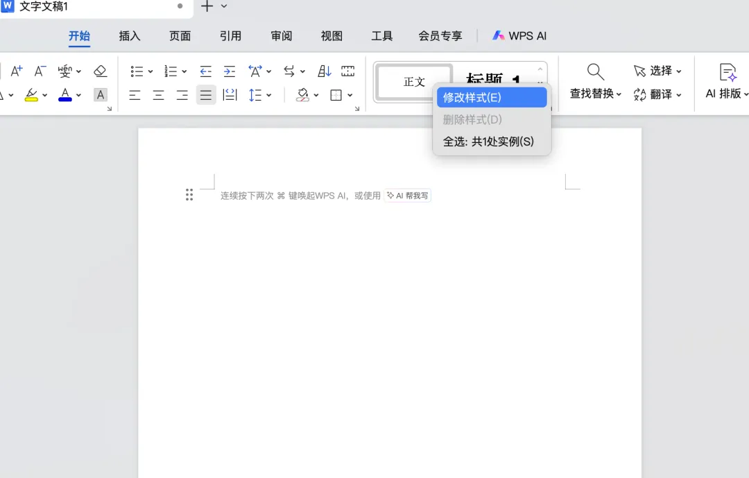右键“标题 1” → 修改