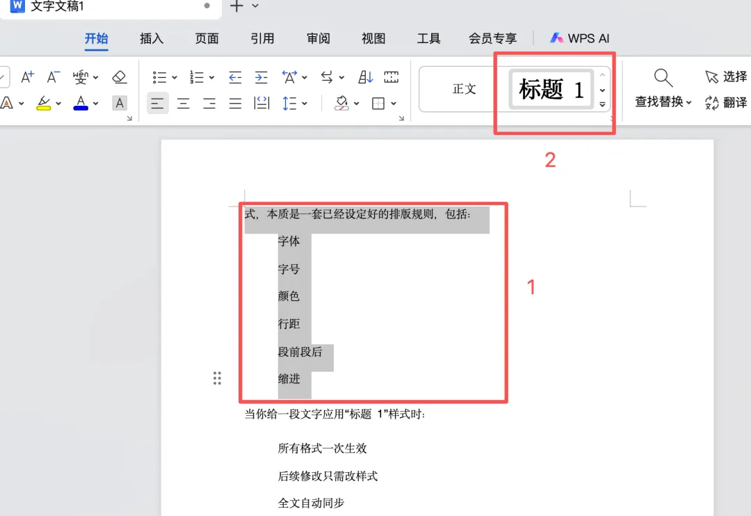 当你给一段文字应用“标题 1”样式时: