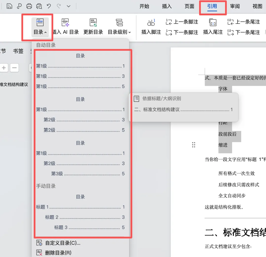 五、自动生成目录(效率关键)