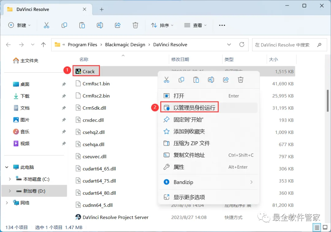 11、回到达芬奇 15.0文件夹,找到【Crack】程序,右键点击【复制按钮】