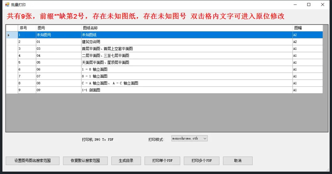 能够自动识别以下图框:A4,A3,A2,A2+25%,A2+50%,A2+75%,A2+100%,A2+125%,A2+150%,A2+175%,A2+200%,A1,A1+25%,A1+50%,A1+75%,A1+100%,A1+125%,A1+150%,A0,A0+25%,A0+50%,A0+75%,A0+100%共23种。