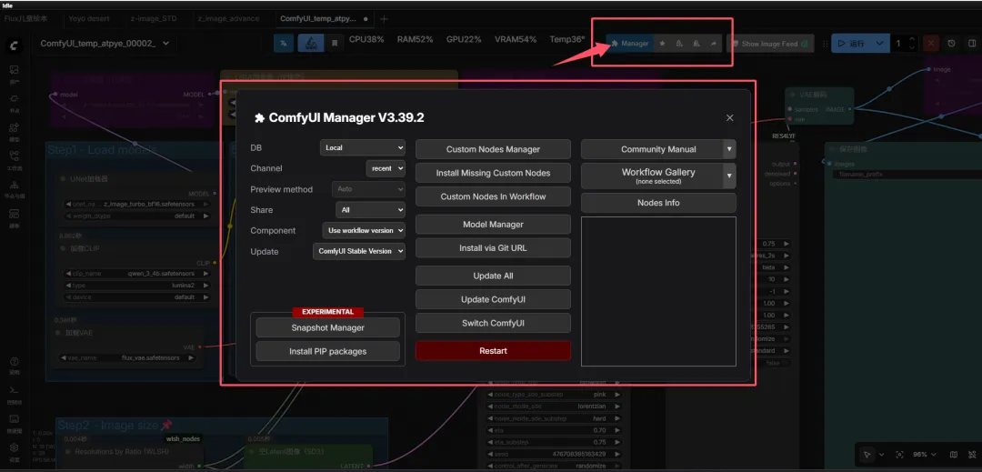 2. 点击“Manager”按钮,进入Comfyui Manager操作界面,这里你需要知道的Manager核心功能详解