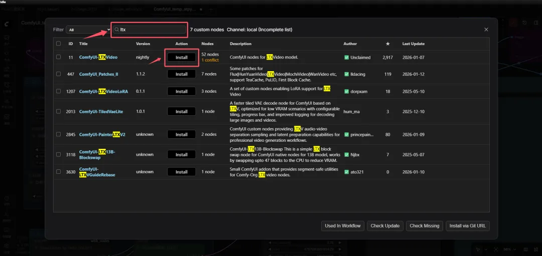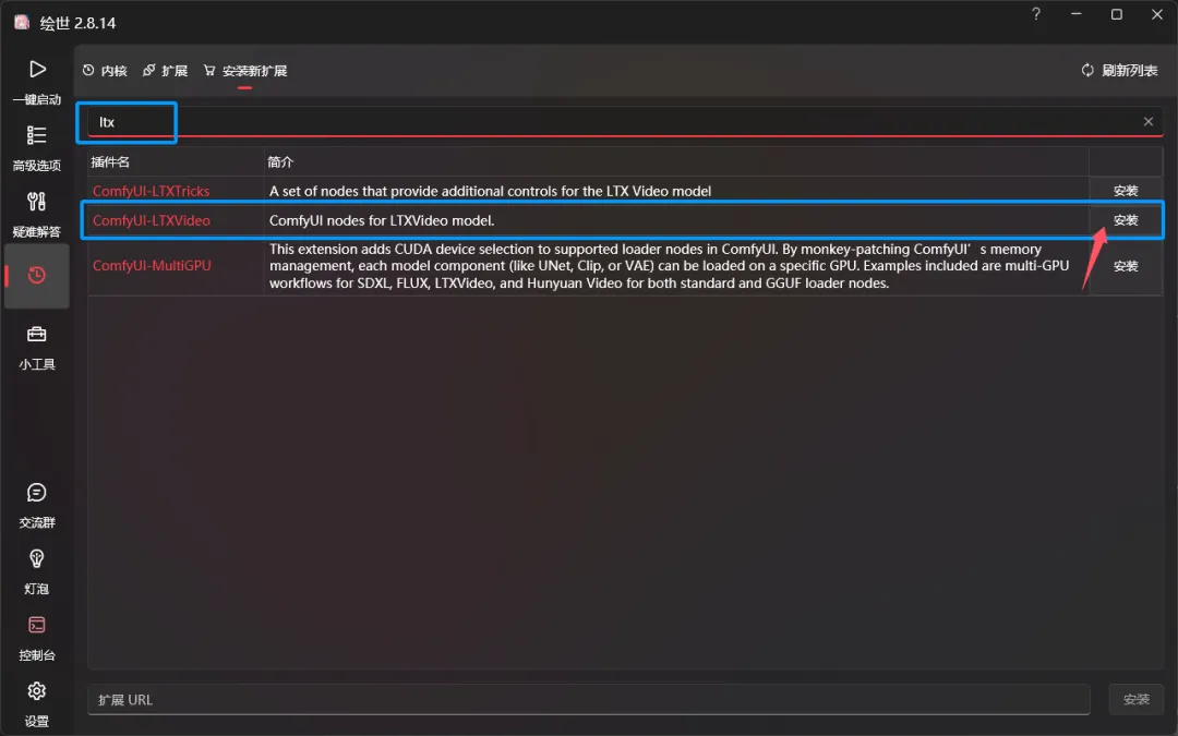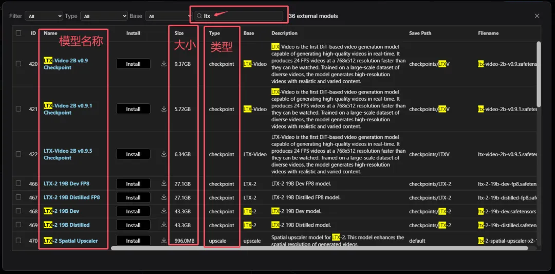 Manager集成了模型下载通道,可以直接下载:Checkpoint、LoRA、ControlNet、VAE等模型,也同样支持关键词搜索,以“LTX”为例,如: