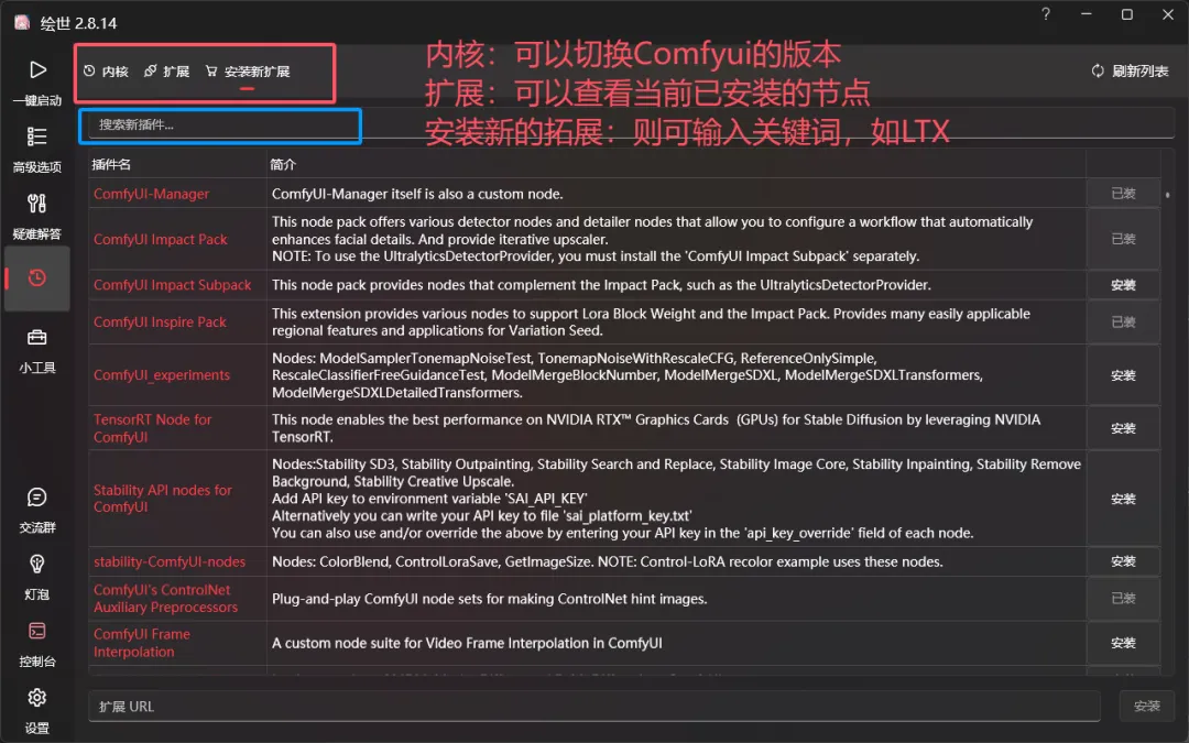 首先打开启动器,在左边选项卡中选择“版本管理”,进入到安装界面。可以根据需求切换内核版本、查看已安装拓展(插件)和安装新的拓展(插件)。安装新的拓展(插件)时,也可以把插件下载链接粘贴到URL栏来进行安装。