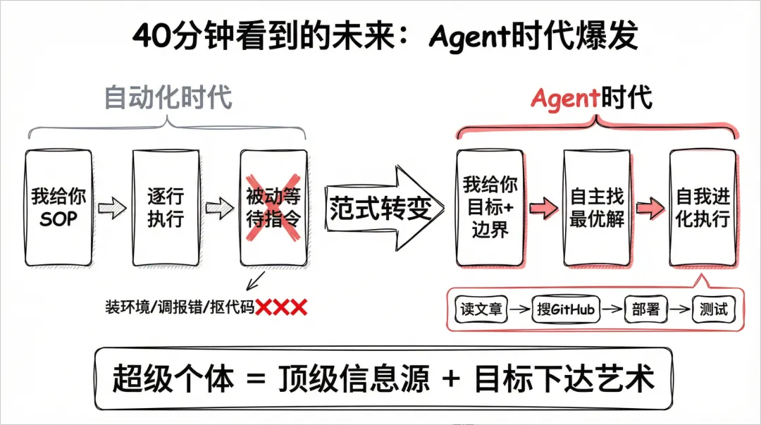 如果你现在还在为了装一个环境、调一个报错而跟AI逐行抠代码,你的方向可能全错了。未来的超级个体,只需要做两件事:拥有顶级的商业信息源(知道哪篇文章、哪个开源项目最牛),掌握下达目标的艺术(把链接扔给AI,让它自己去进化)。