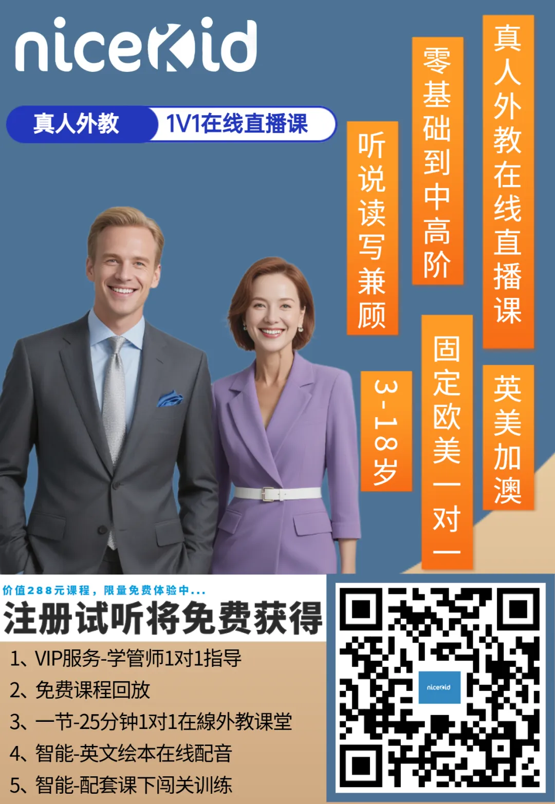 推荐理由:作为业内口碑极佳的平台,nicekid在教学质量、师资稳定性和课程体系方面都做到了高度专业。感兴趣的家长可以扫码领取免费试听课,先体验看看孩子适不适应。
