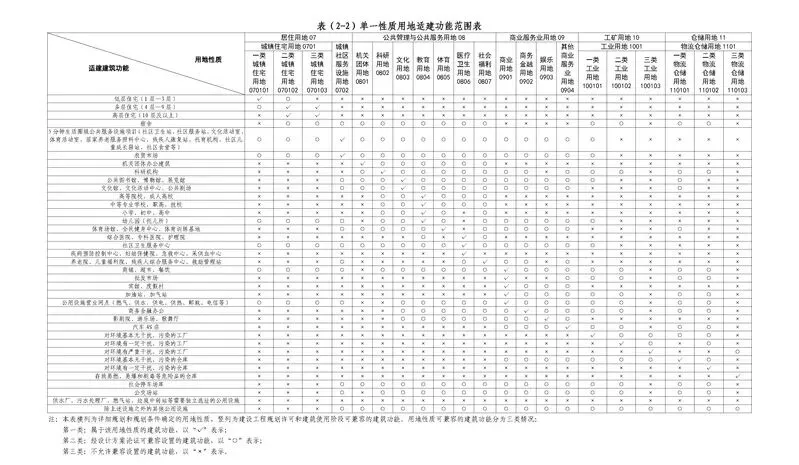 2.单一地块被明确规定用于一种特定用途的,被称为单一性质用地。单一性质的城镇住宅用地、城镇社区服务设施用地、商业服务业用地、公共管理与公共服务用地、工业用地和物流仓储用地及其细分地类,属于该特定用途的建筑功能比例应不低于表(2-1)的规定。以上单一性质用地在建设工程规划许可和建筑使用阶段可兼容的建筑功能应符合表(2-2)的规定。