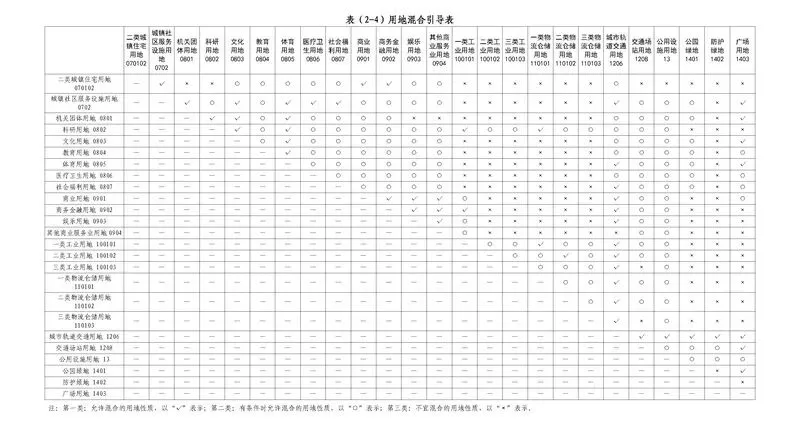 5.单一地块被明确规定可用于两种或两种以上特定用途的,被称为混合性质用地,用地代码采用“A/B/C……”的表达形式。在详细规划编制、实施时,用地之间的混合可参照表(2-4)。