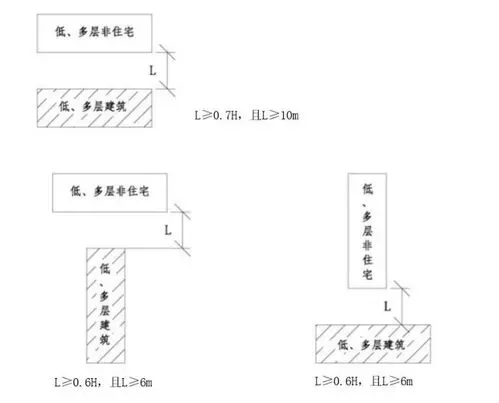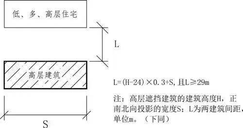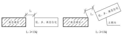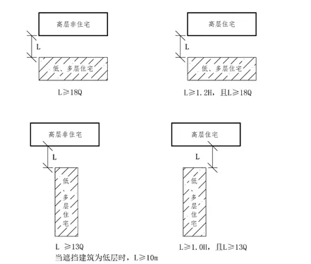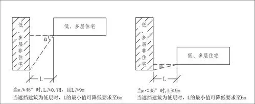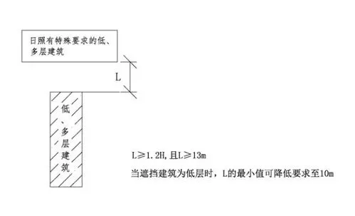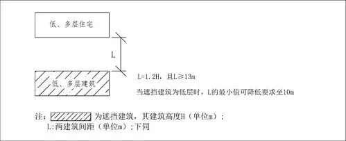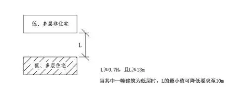2.住宅正面间距不应小于13米,但遮挡建筑为低层时最小值可降低要求至10米,且应符合下列规定: