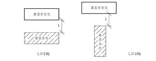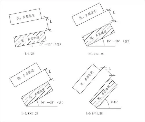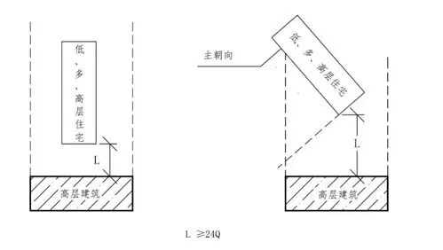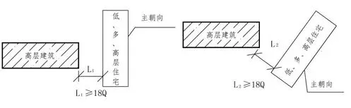 12.一建筑面向另一建筑:非平行布置的两建筑,如果一建筑的一个外墙面的垂直线与另一建筑的外墙面相交,则认为一建筑面向另一建筑。