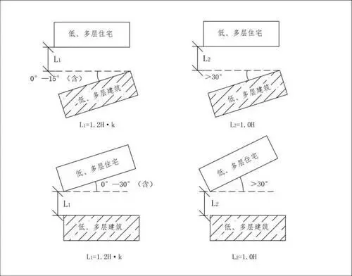 (2)平行布置且方位为非正南北向时,住宅正面间距可按下表(3-1)“不同方位间距折减系数k”换算。