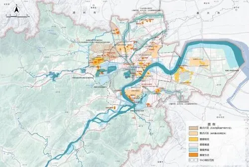 历史文化和遗产保护片区:大运河核心监控区(老城空间、近岸空间、山河视廊控制空间)、良渚遗址周边景观控制区(不含良渚遗址全国重点文物保护单位保护范围)、西湖文化景观缓冲区;湖滨历史文化片区、皇城历史文化片区、笕桥-航校历史文化片区、拱宸历史文化片区、长河历史文化片区。 |