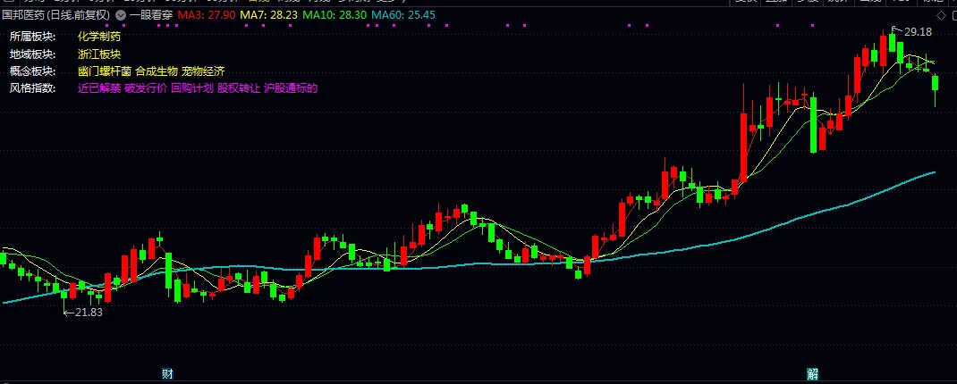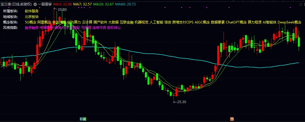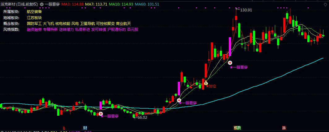 🔹 多周期均线:3日、7日、10日、60日均线组合,通过颜色区分短中长期趋势结构 🔹 三重信号模型:”一眼看穿”主信号、”捉妖信号”、”强势拉升”信号分层触发,形成观察梯度🔹 板块信息集成:右上方固定显示所属板块、地域及概念,辅助热点关联分析