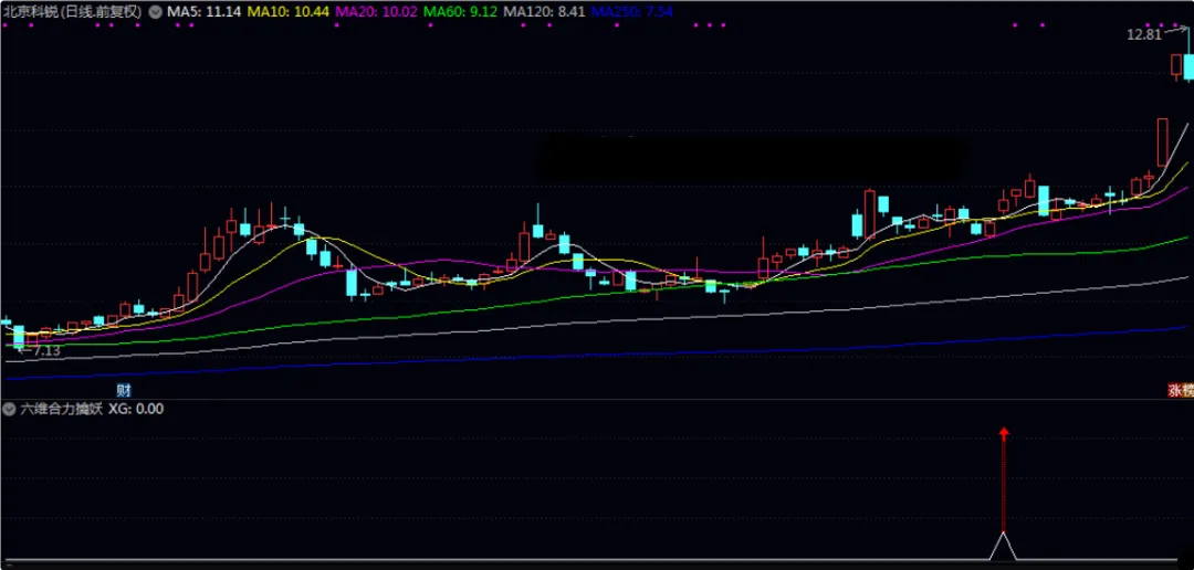 视觉特征:副图出现红色向上箭头,标记六维共振信号