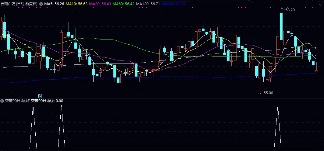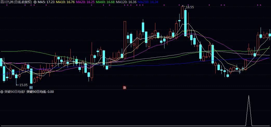 🔹 趋势突破:90日均线作为”牛熊分界线”,是长期走势的”任督二脉”。信号触发需满足:昨日收盘价<90日均线,今日收盘价>90日均线