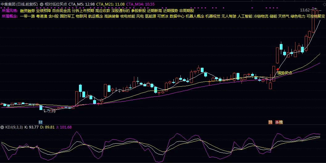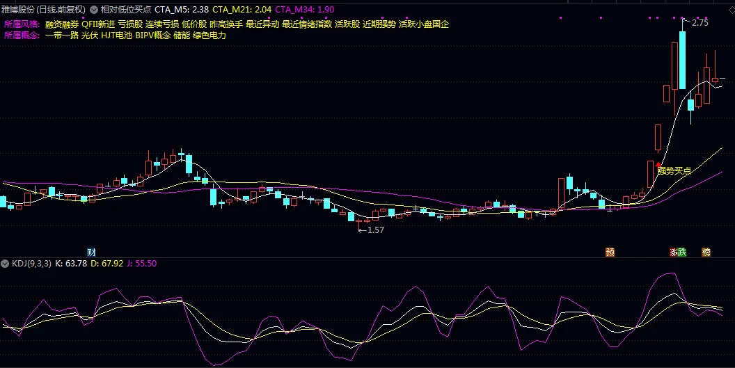 视觉特征:主图左上角显示所属风格与概念板块,信号出现时标注黄色图标及”强势买点”文字
