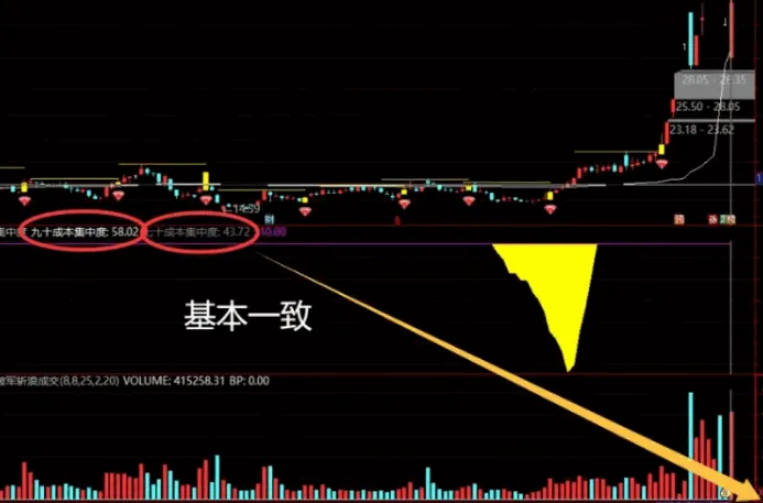 副图:黄色带(70%筹码集中)、紫色带(90%筹码集中)