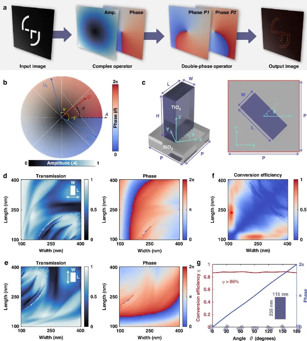 核心概念:团队提出了名为 “超表面算子(meta-operators)” 的通用化光计算平台,通过双相位编码技术将任意复杂的复振幅调制转化为两个纯相位分布,再结合线偏振 / 圆偏振复用技术,在单层超表面上实现两个正交偏振态的独立相位调控,通过偏振分量干涉重构目标光学传递函数,最终在单块无源器件中完成任意全光图像变换。