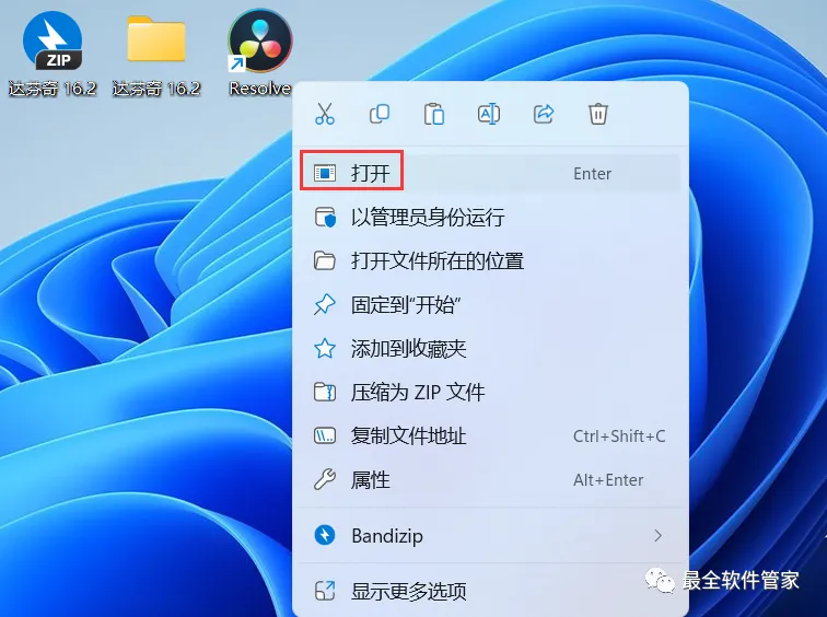 17、回到桌面,右键桌面上的【DaVinci Resolve软件图标】,点击【打开】