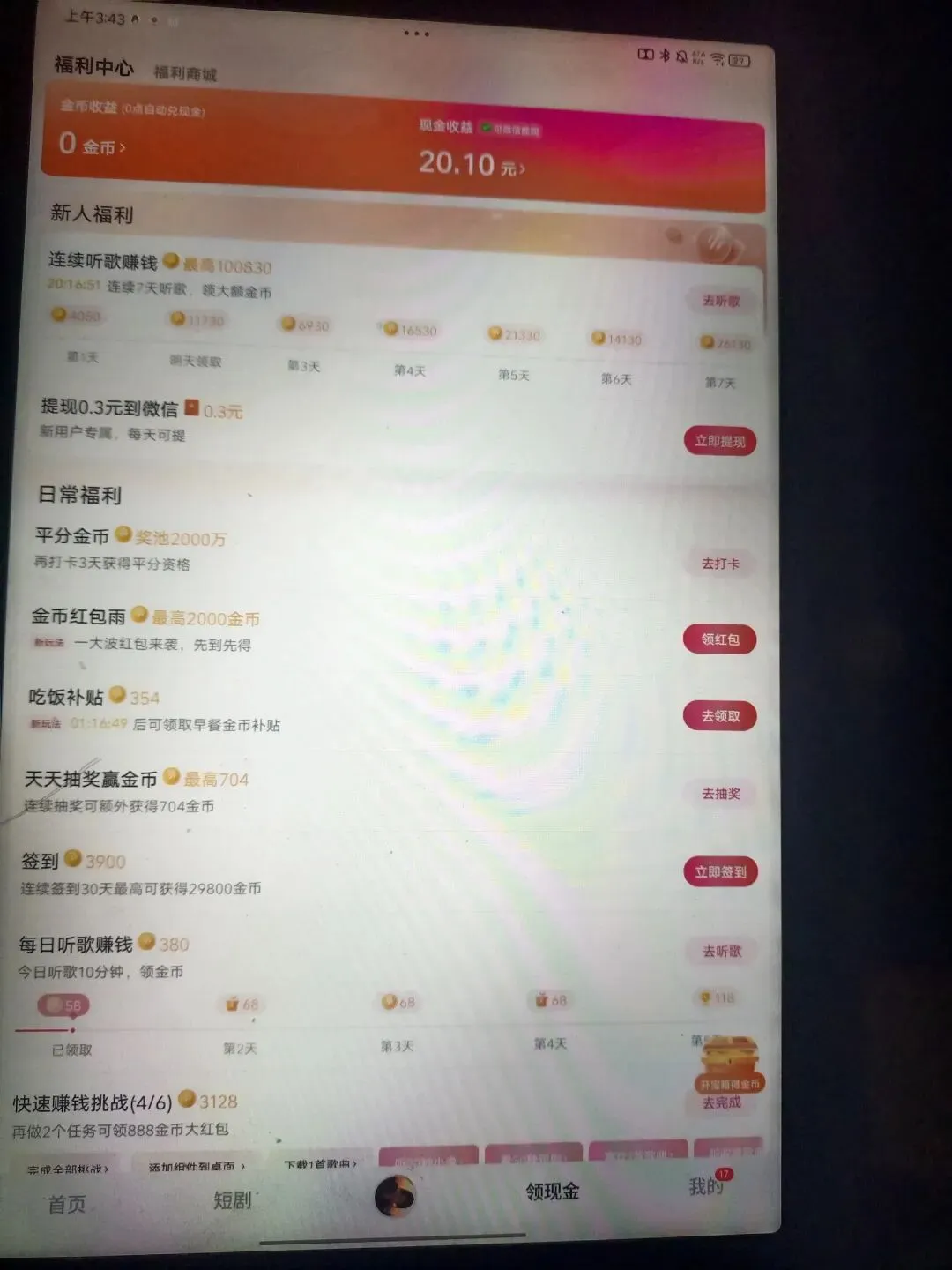 签到、红包雨、吃饭补贴、宝箱得金币我是一定会做的,我爱看短剧,有时看上瘾了,可以一口气刷完。我还喜欢听书,内容包括情感的、心理的是我的最爱。所以这些所谓的任务对我来说是开心的事,顺手可做的事。以前下载这些App,刚开始只是为了看免费短剧,听音乐,想着能挣一点零钱,后来发现除了这些功能,买东西还可以打折,打折券有三块五块,有时好可以优惠二十块钱,所以我觉得真的是很便利。哪次我要买东西的时候给你出个教程,谁让我就是爱分享呢。