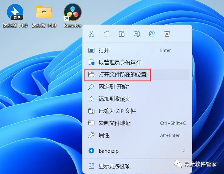13、回到桌面,右键桌面上的【DaVinci Resolve软件图标】,点击【打开文件所在的位置】