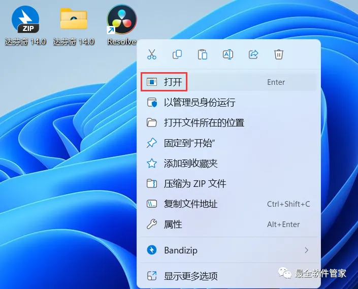 16、回到桌面,右键桌面上的【DaVinci Resolve软件图标】,点击【打开】