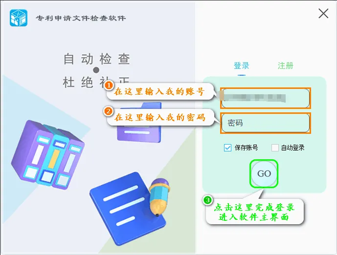 我们进入软件后首先进入登录按钮,输入“账号”、“密码”,点击“GO”按钮进入到软件系统的主界面,在登陆界面勾选“保存账号”选择框再次进入软件时会自动填入账号,在登录界面勾选“自动登录”选择框再次进入软件时会自动登录