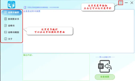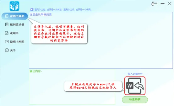 将五书形式的word文件(见示例文件)拖放至导入图标处或鼠标左键单击导入图标可导入文件,稍等片刻后文本即可导入成功,五书会在对应界面的编辑框进行展示