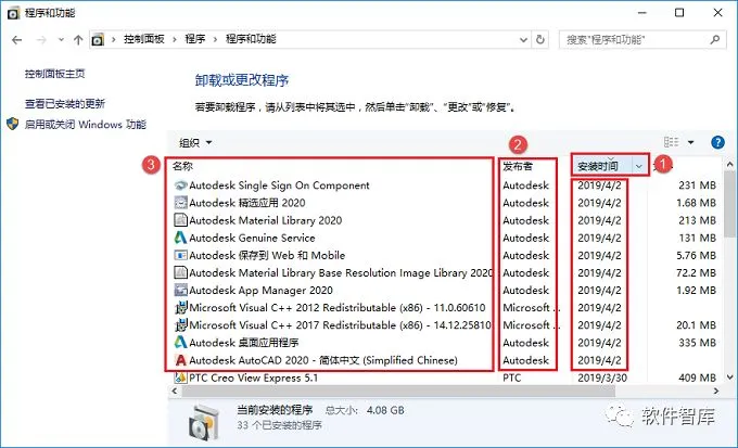 3.点击【安装时间】,然后在左侧“发布者”栏下找到所有Autodesk,这里需将左侧其对应的所有程序全部卸载,注意:小编电脑里面有9个,因安装过程中选择的插件不同对应的Autodesk程序数也略有不同