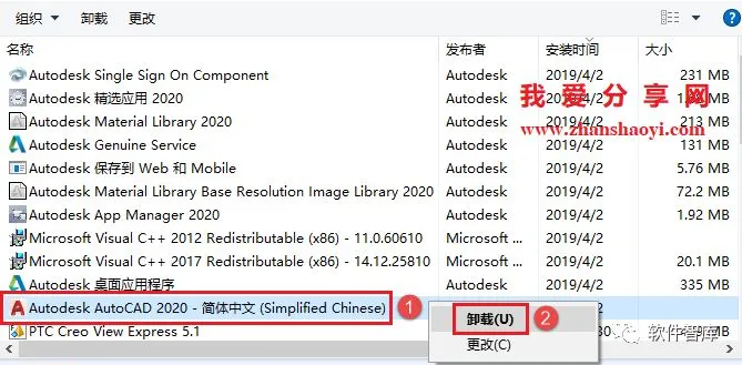 4.首先,找到AutoCAD 2020第一个程序,单击选中Autodsk AutoCAD 2020-简体中文(Simplified Chinese),鼠标右击选择【卸载】