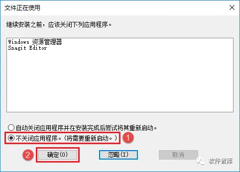 7.正在卸载中,如果卸载过程中弹出“文件正在使用”的窗口,先勾选“不关闭应用程序”,然后点击【确定】