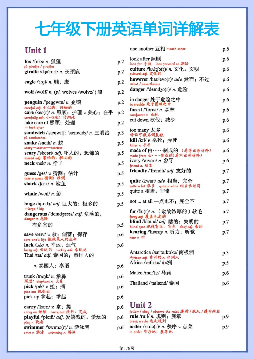 今天给大家带来一份超硬核干货——人教版七年级下册英语全单元单词详解表,从 Unit1 到最后一个单元,全部整理完毕!