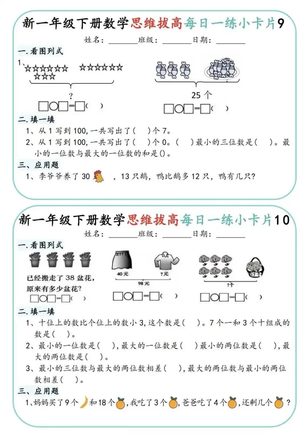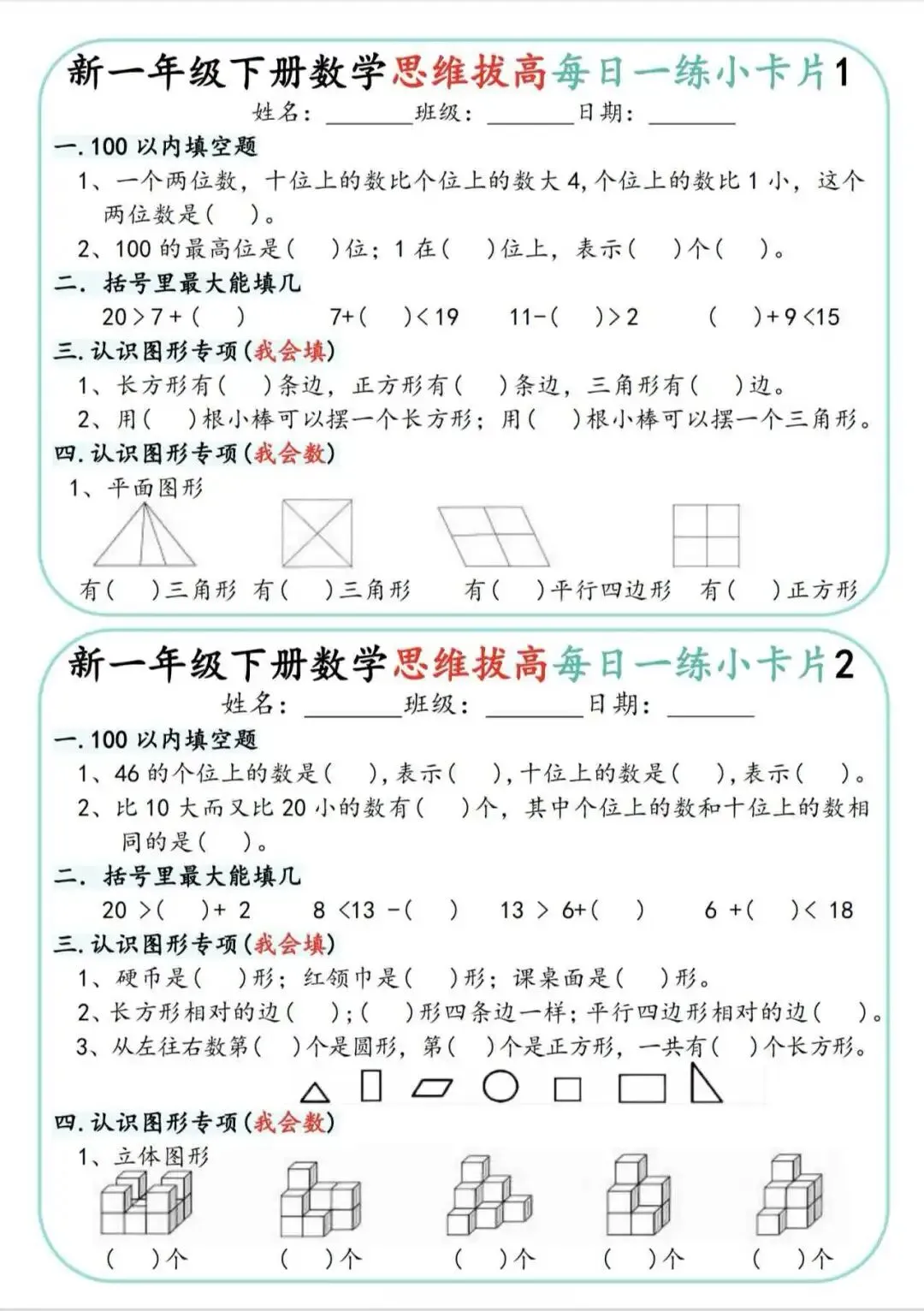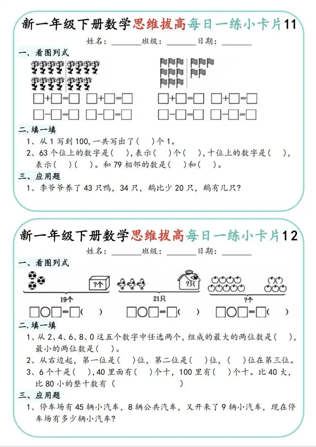 一年级下册数学思维拔高小卡片🔥,100以内填空、图形题、应用题都涵盖,从易到难,一天一练,轻松拔高数学思维。