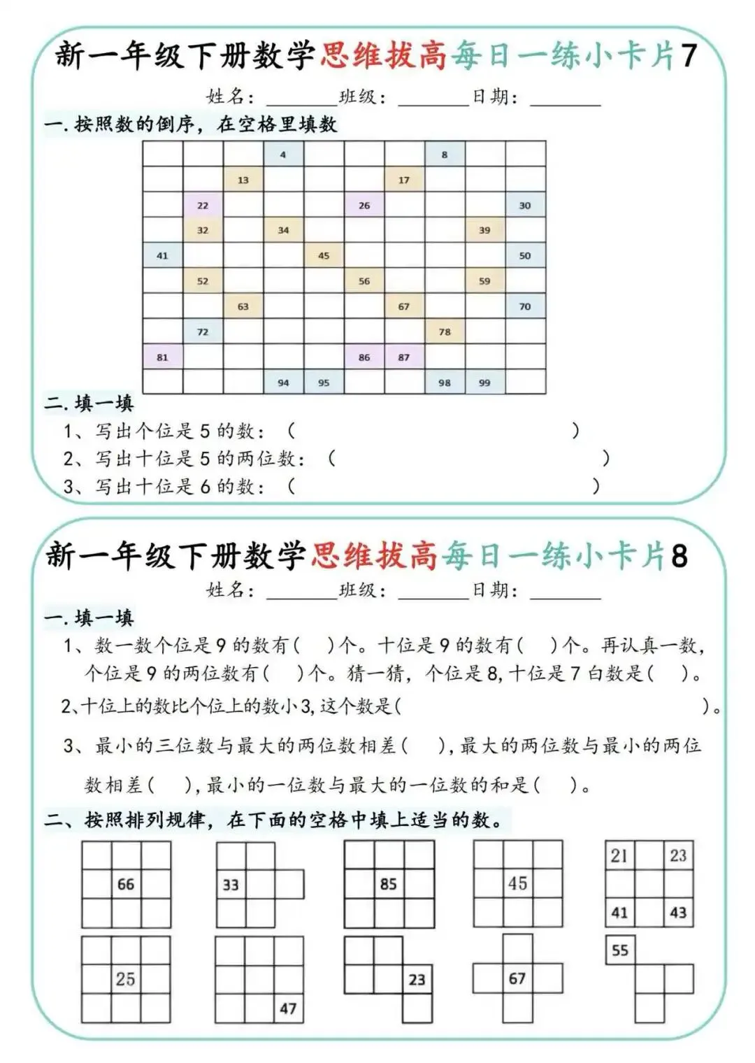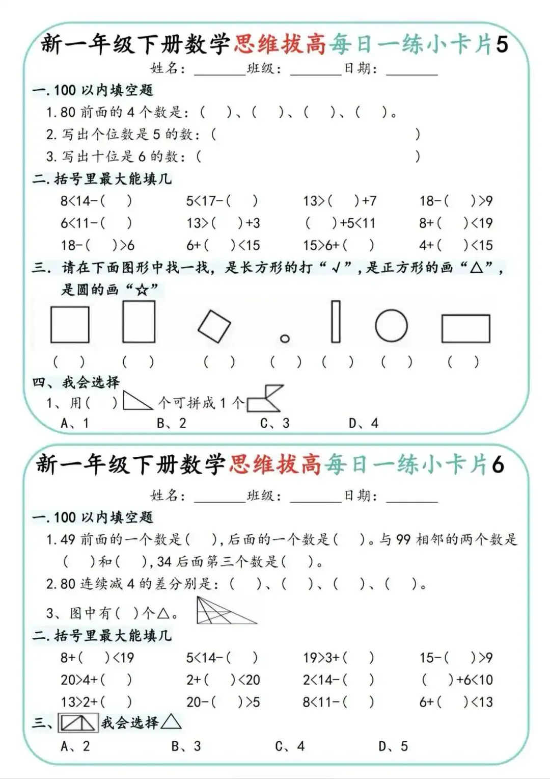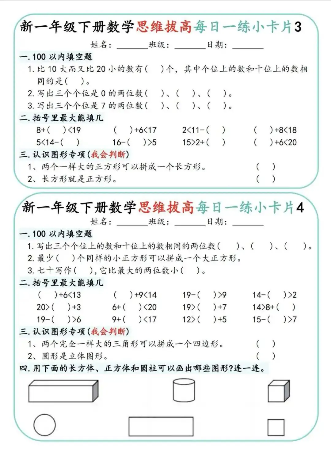 一年级下册数学思维拔高小卡片🔥,100以内填空、图形题、应用题都涵盖,从易到难,一天一练,轻松拔高数学思维。