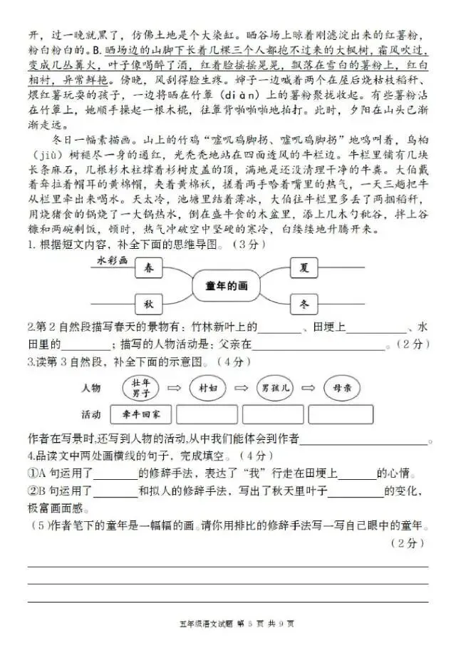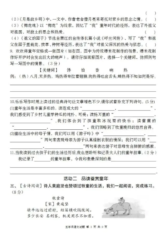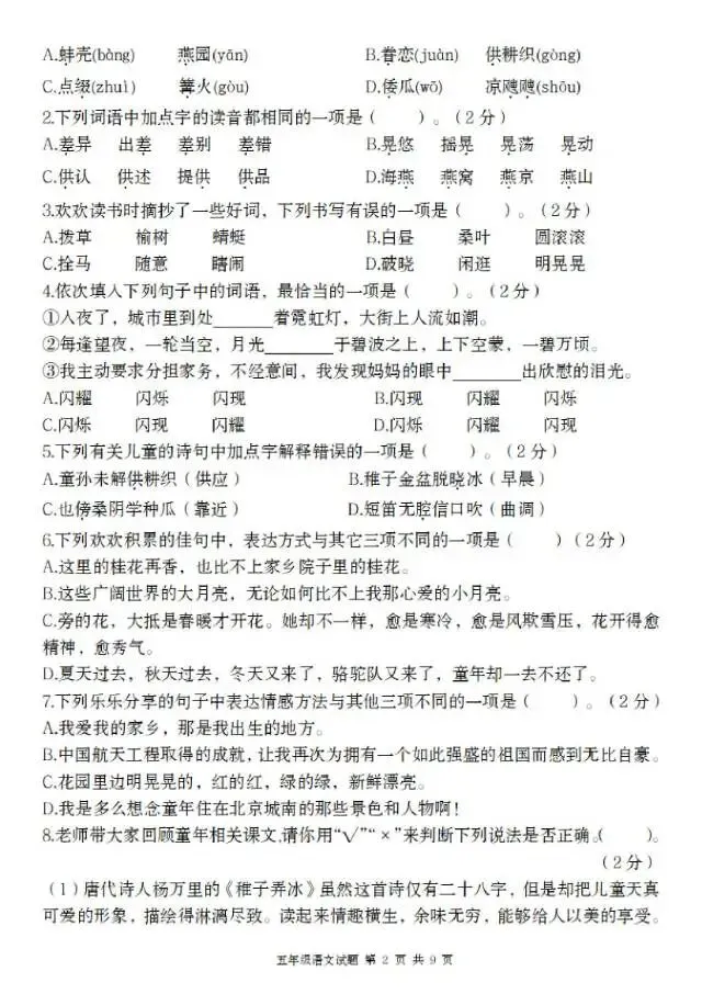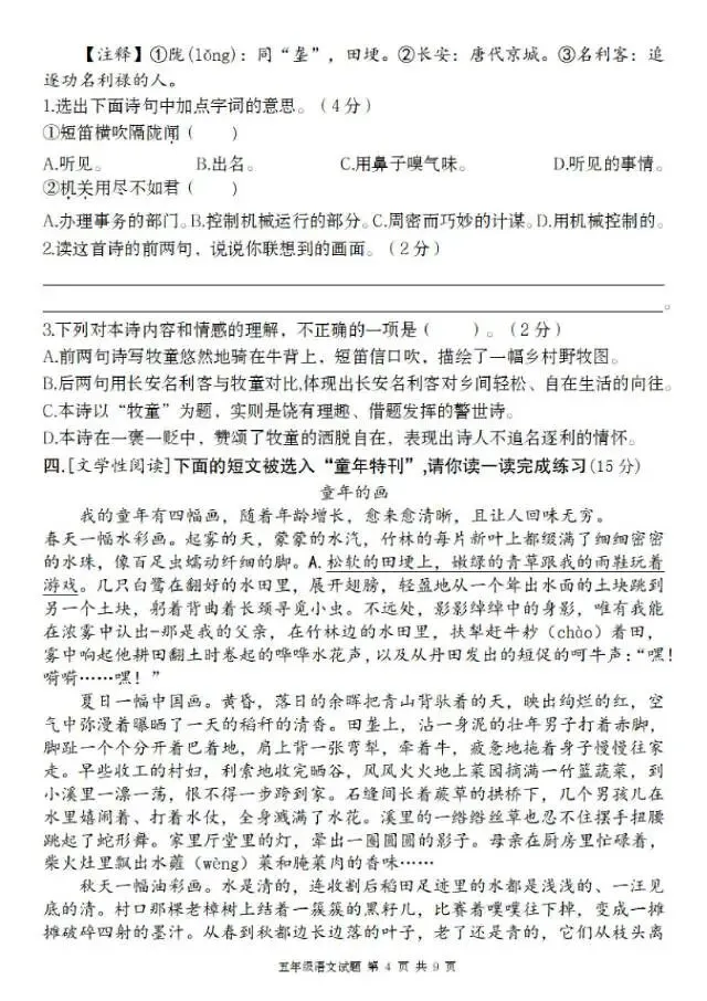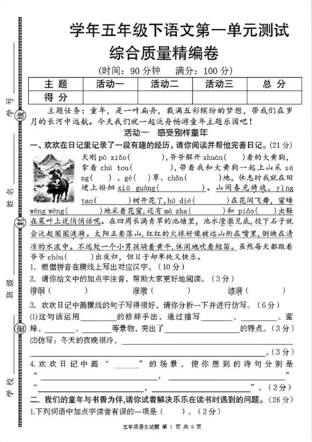 26五年级下册语文第一单元测试卷(电子版可打印)