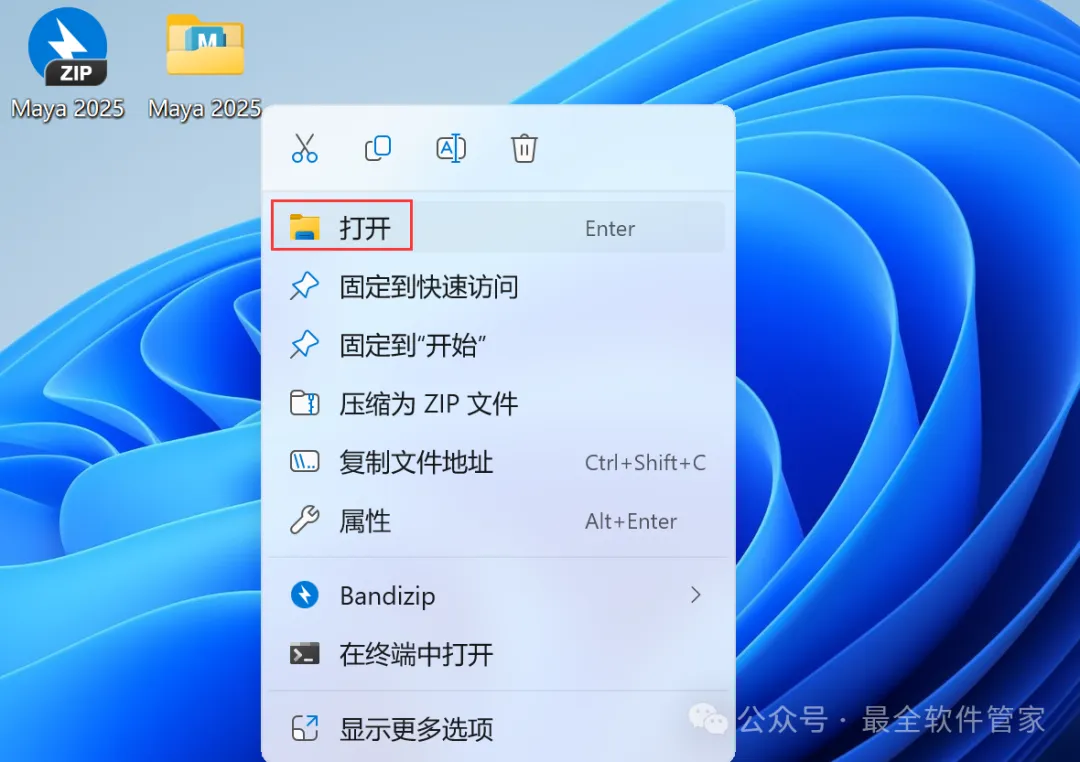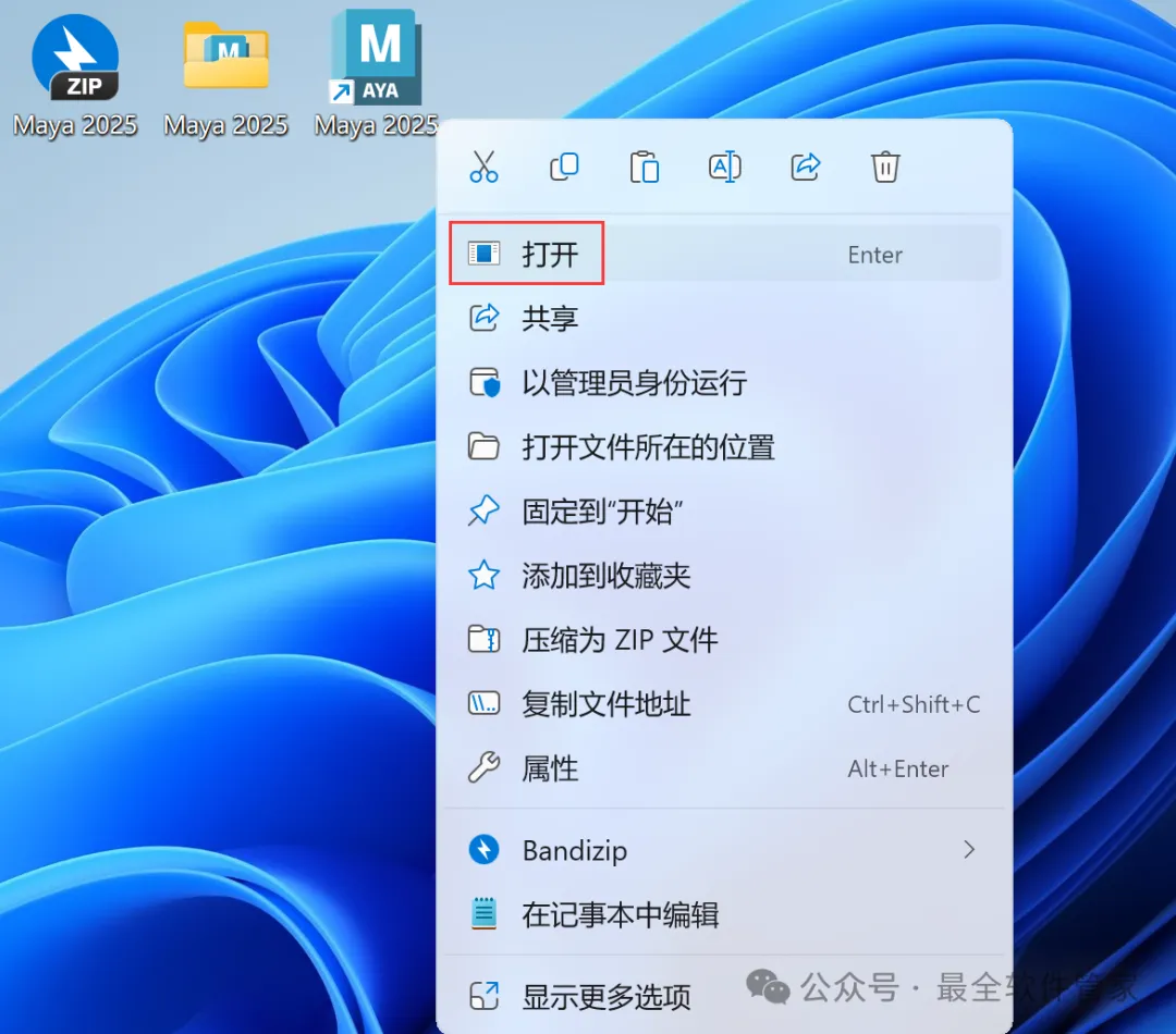 14、回到桌面,右键桌面上的【Maya 2025软件图标】,点击【打开】
