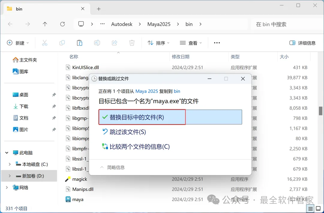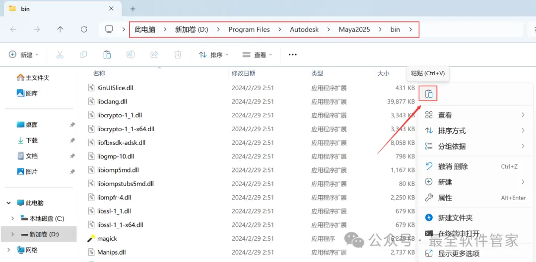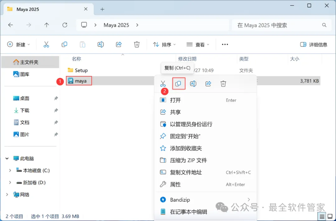 10、回到Maya 2025文件夹,找到【maya】文件,再右键点击【复制按钮】