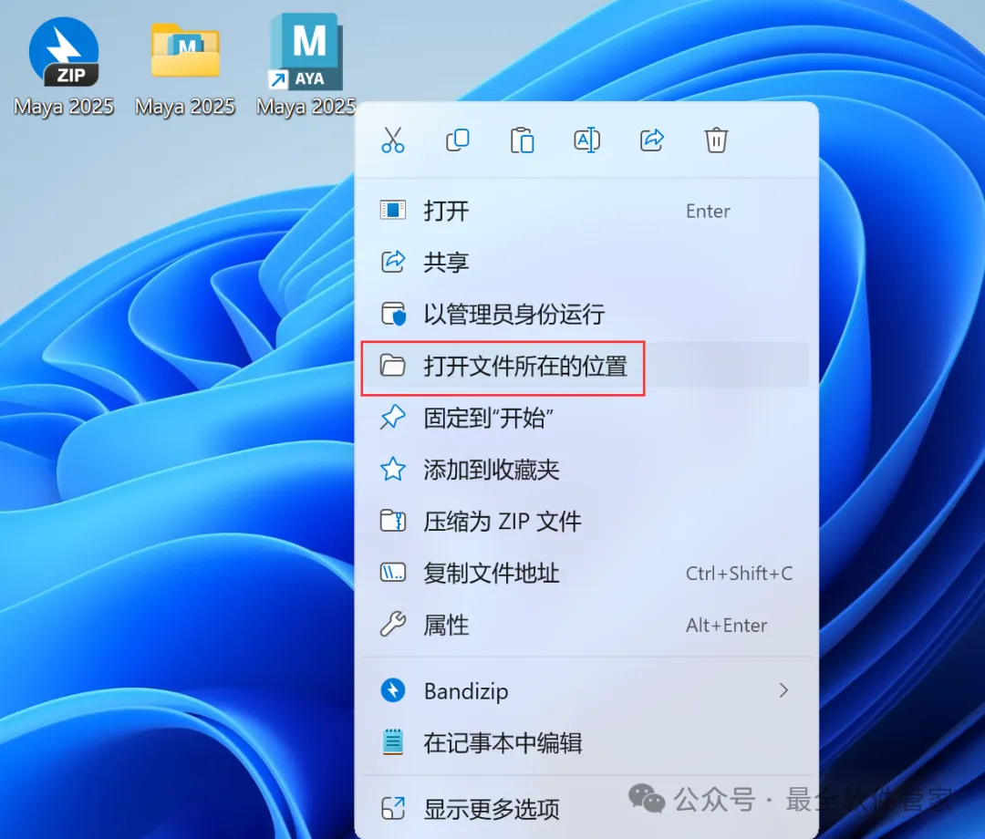 11、回到桌面,右键桌面上的【Maya 2025软件图标】,点击【打开文件所在的位置】