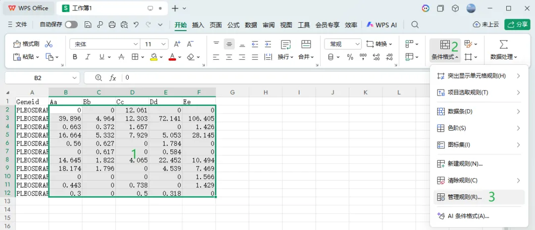 首先,选择云平台的示例数据,按图中123标记的顺序,选择需要上色的部分——>选择条件格式——>选择管理规则或者新建规则。