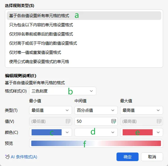 然后,按abc标记的位置进行选择处理,选择基于各自值设置所有单元格的格式-格式样式里选择三色刻度,点击确定,漂亮热图的配色就有了。如果需要,可以把f位置截图用做图例。