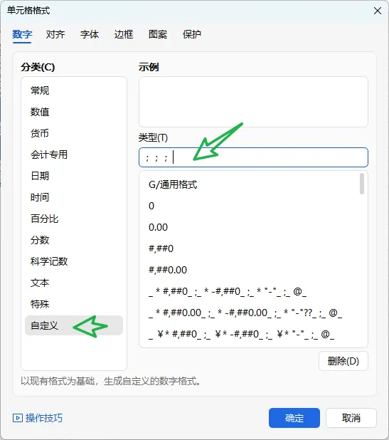 接下来,设置去除下单元格里的数字,鼠标右键–设置单元格格式,如图中箭头所示选择自定义— “;;;”(复制引号里面的粘贴下)