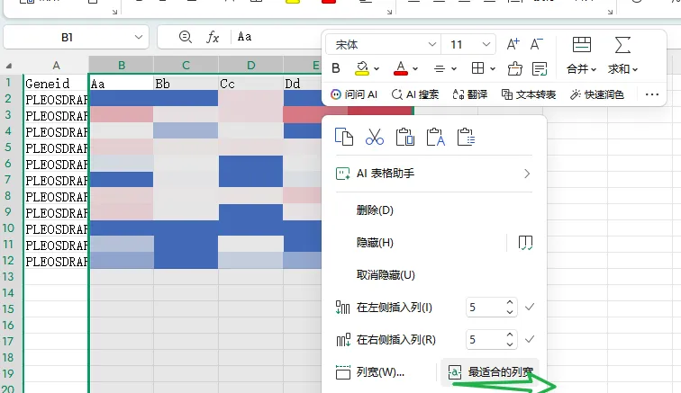 接下来,调整下单元格的宽度,可以手动调整,也可以右键–最合适的列宽