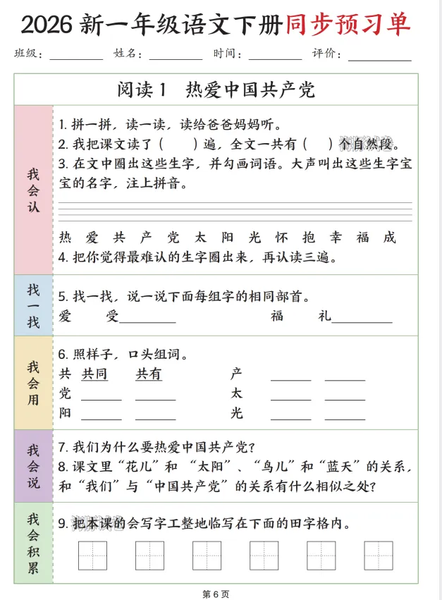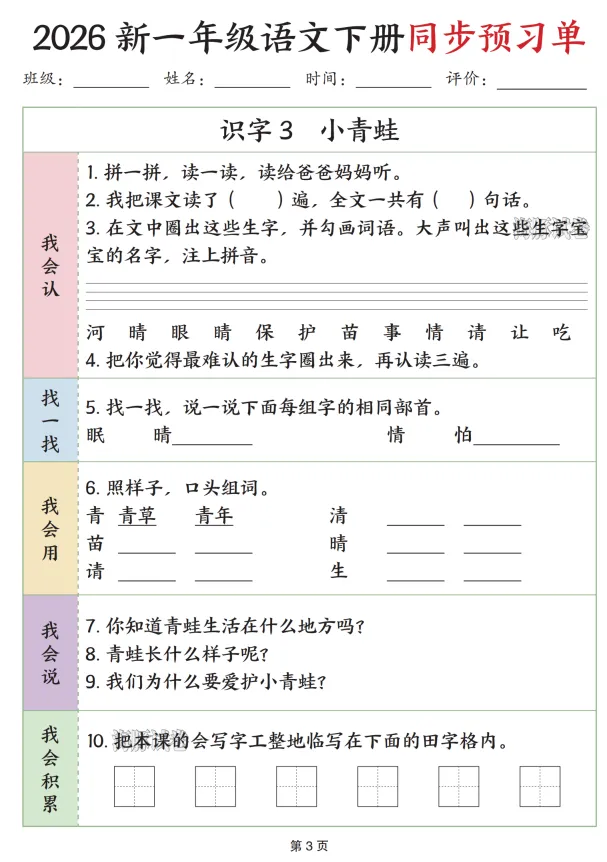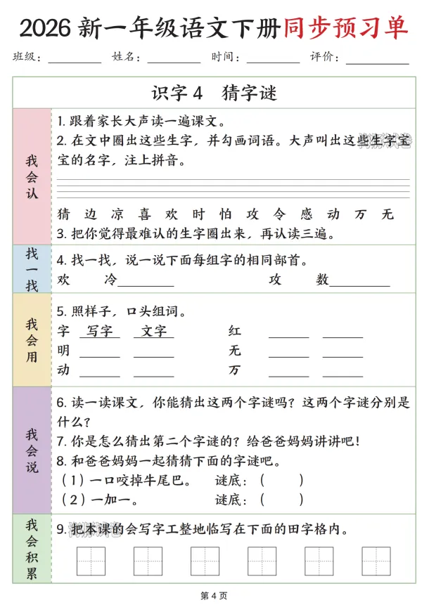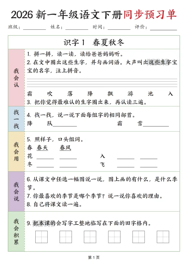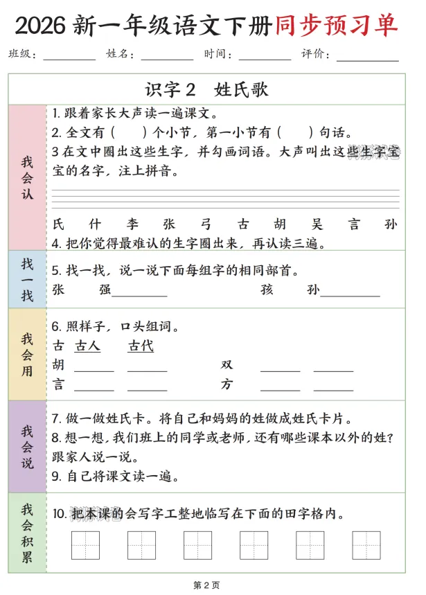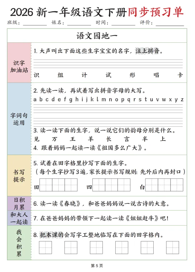 26年新一年级(下)语文同步预习单,电子版可下载打印